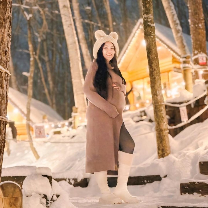 Melalui unggahan di Instagram, Via membagikan potret kehamilan keduanya di tengah indahnya suasana salju Jepang. Foto ini diambil saat Via dan keluarganya tengah liburan di Jepang.