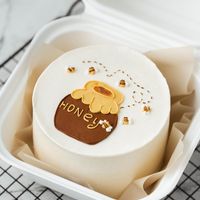 - Olesi permukaan atas kue dengan cokelat masak putih dan buat garis belah ketupat dengan olesan cokelat masak hitam di atasnya