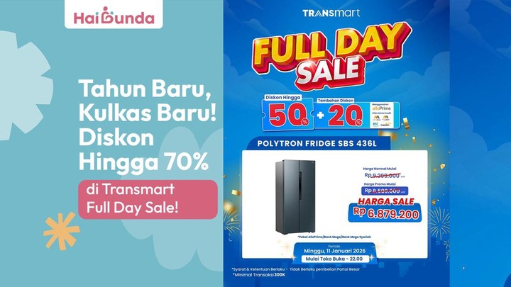 Sabtu, 10 Jan 2026 10:40 WIBPada Sabtu besok (11/1/2026), Bunda bisa mewujudkan impian punya kulkas side by side dengan harga Rp6 jutaan saja. Di mana lagi kalau bukan di Transmart Full Day Sale? Bunda bisa dapatkan promo 50%+20% dengan menggunakan Kartu Debit atau Kartu Kredit Bank Mega, atau juga bisa menggunakan Allo Bank atau Allo PayLater. Tenang Bunda, tidak hanya peralatan elektronik saja yang bisa Bunda dapatkan secara hemat. Kebutuhan lain seperti sayuran, buah-buahan, baju anak, hingga sepeda, juga bisa Bun!