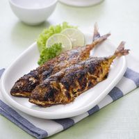 - Nyalakan api arang, bakar ikan kembung hingga kuning kecokelatan, angkat dan sisihkan.