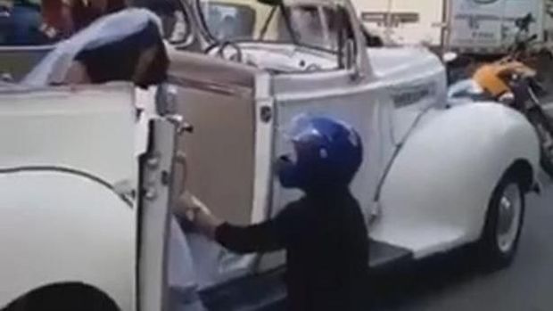 Aksinya terekam dalam video, pengendara motor itu terlihat berbicara dan berlutut. Dilansir